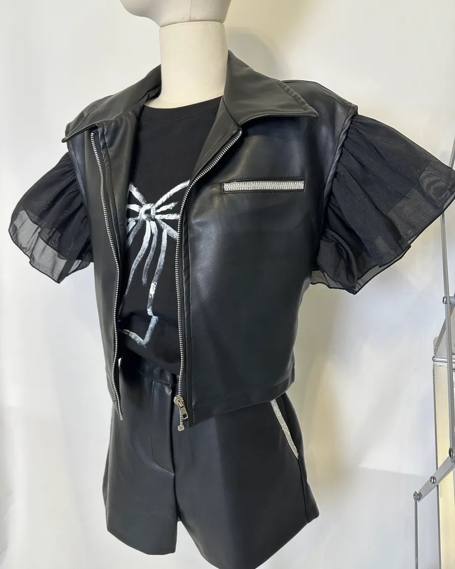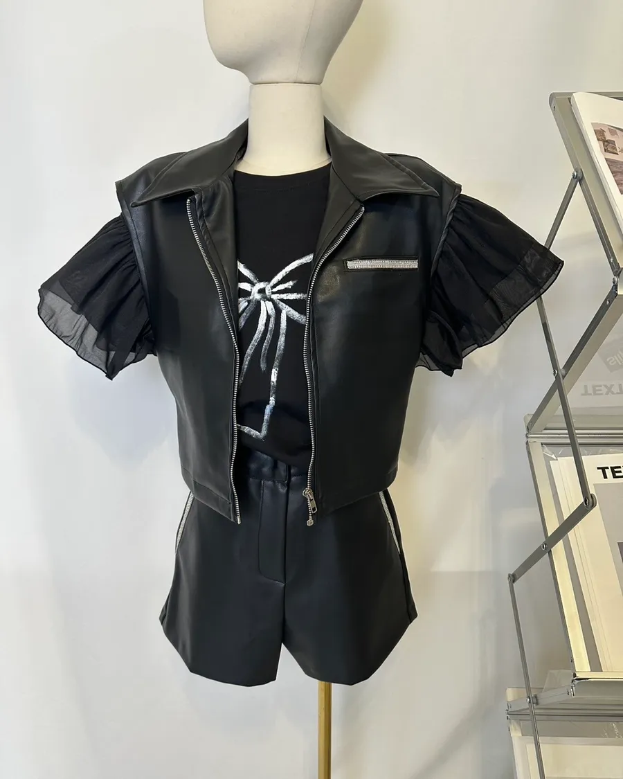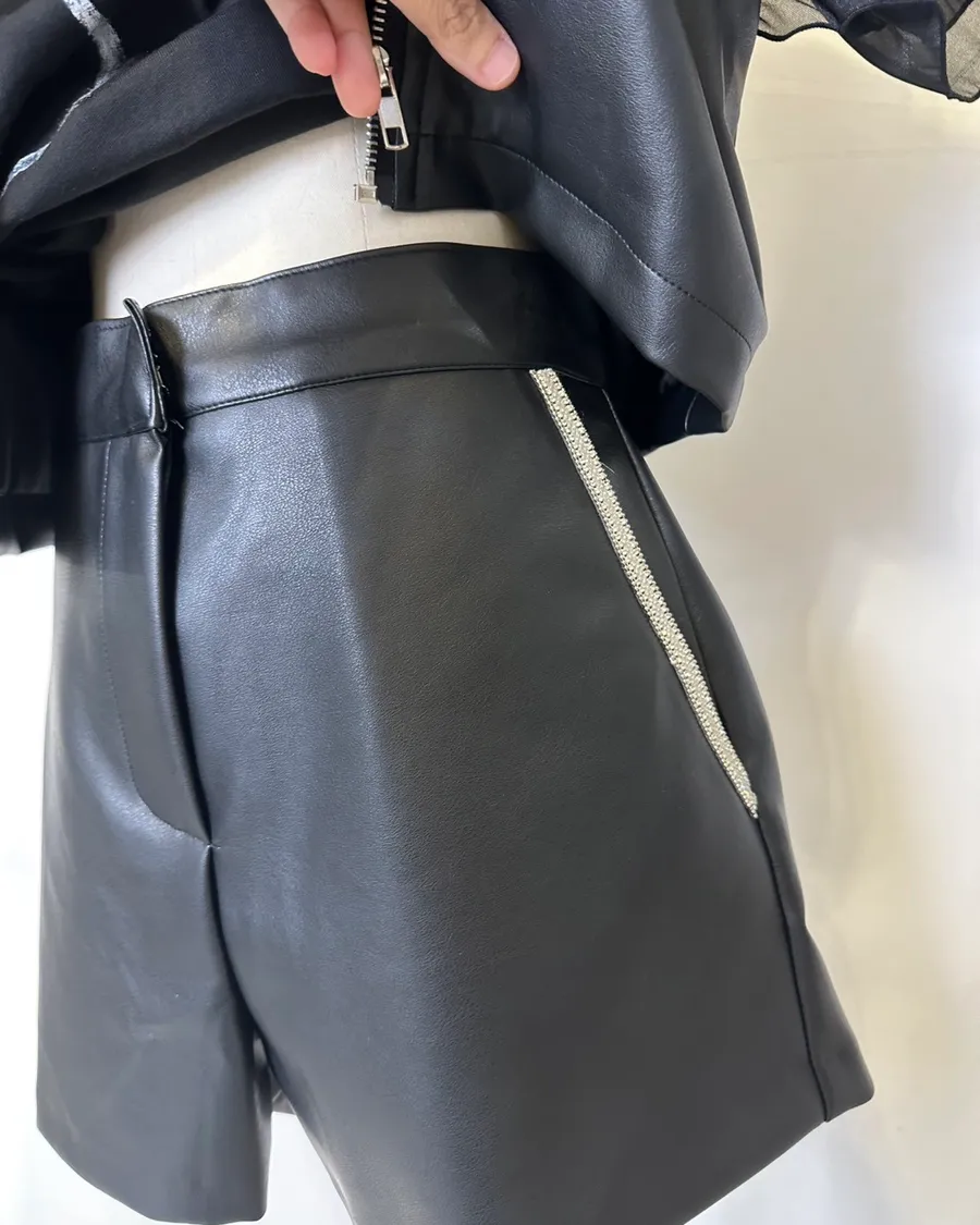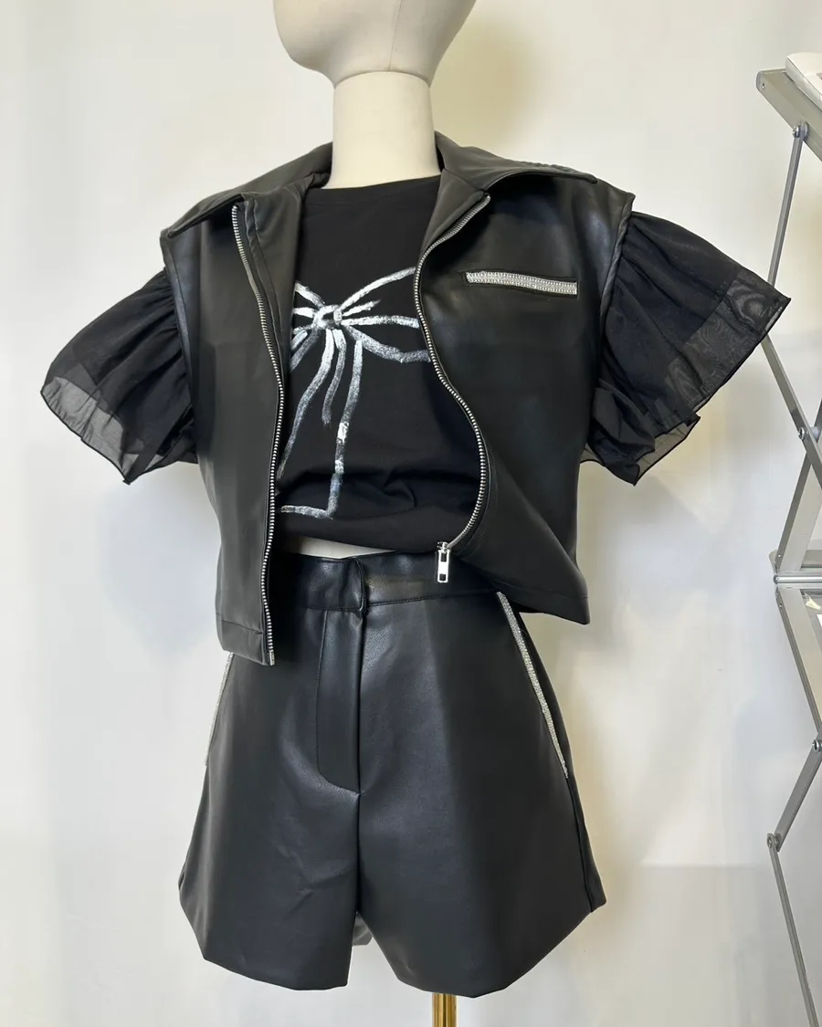 個性水鑽拉鍊翻領短褲套裝