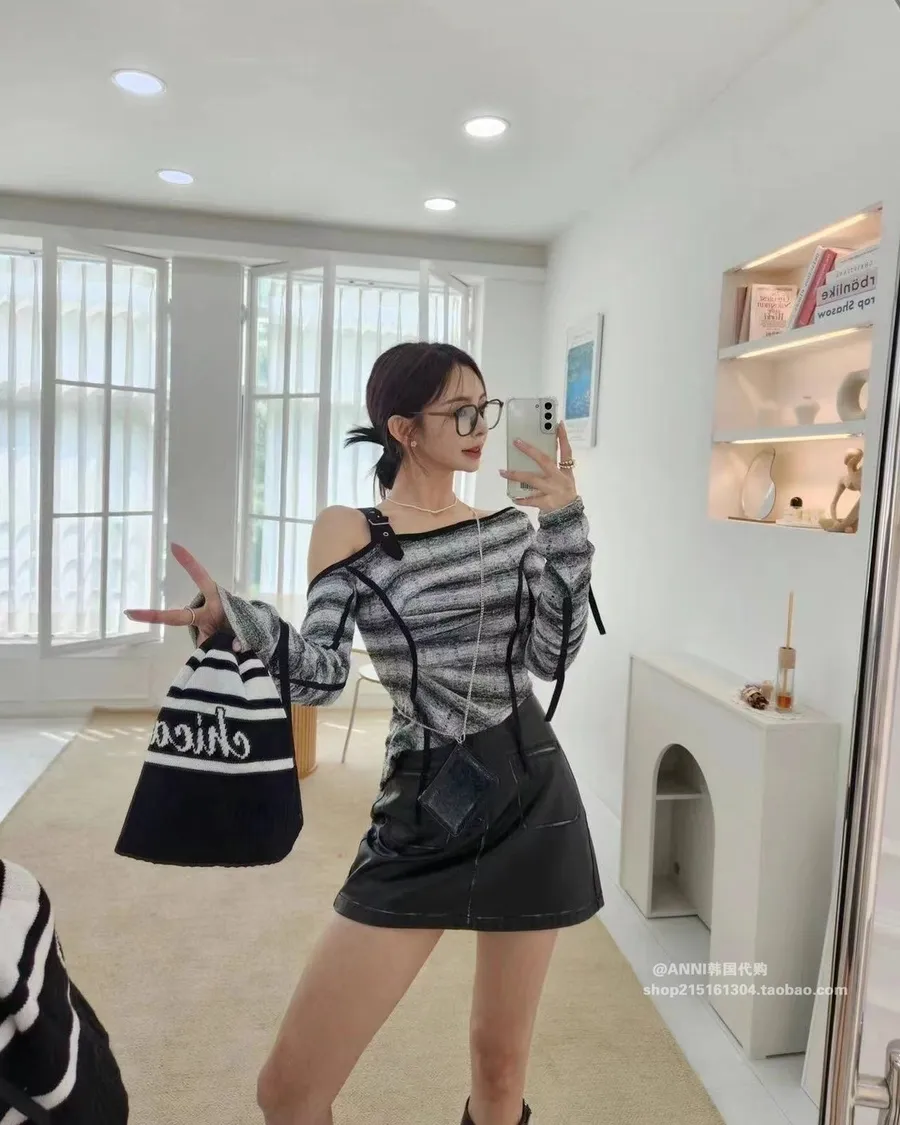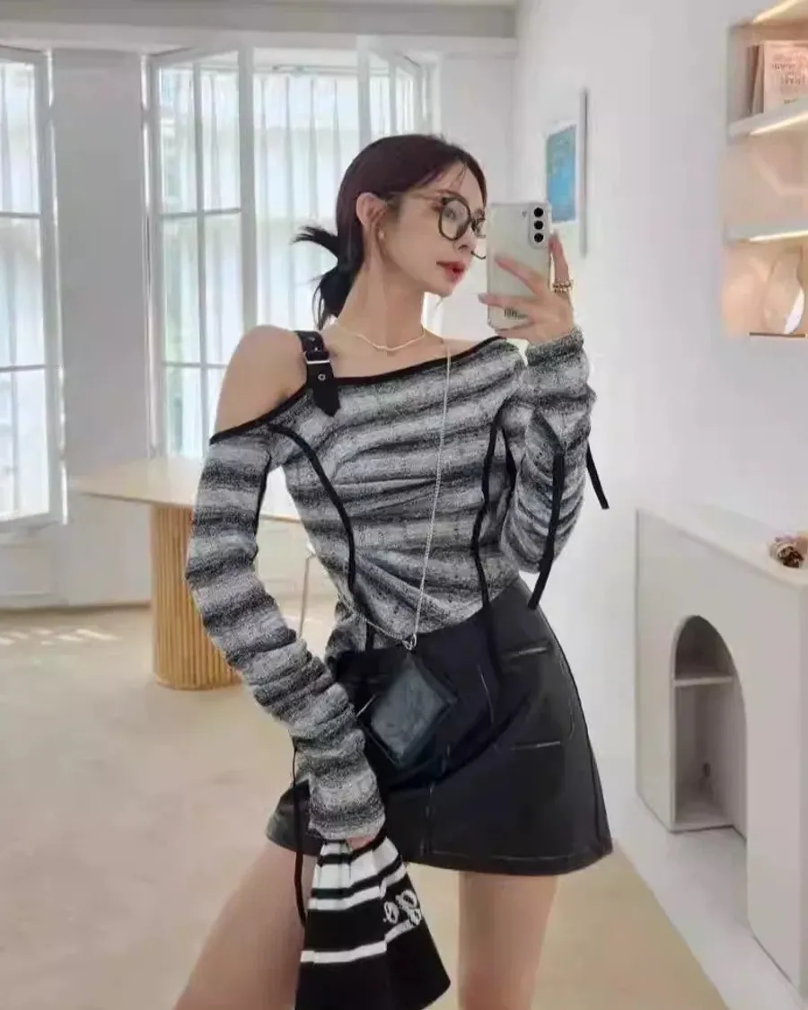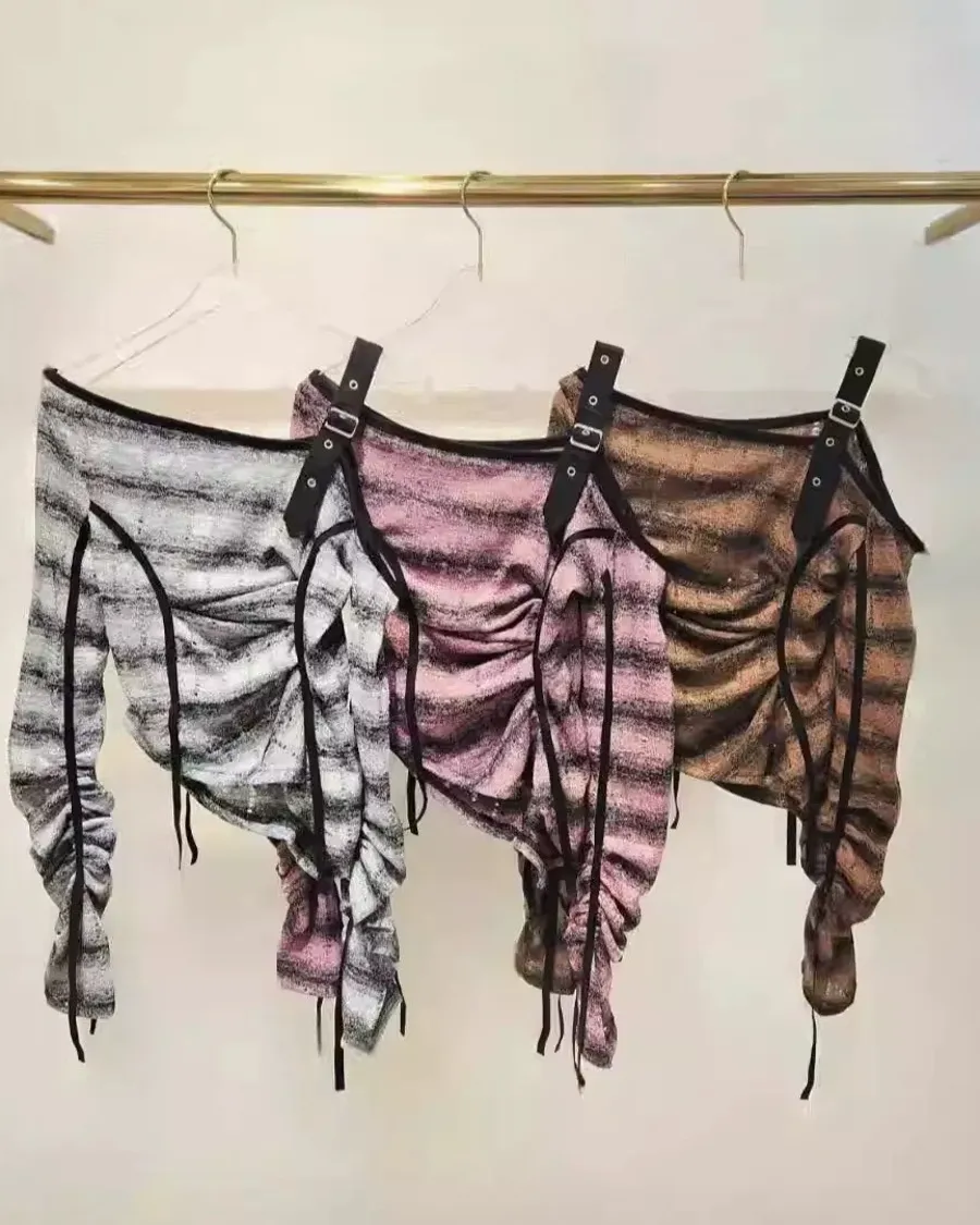 露肩皮帶扣條文拼色套裝