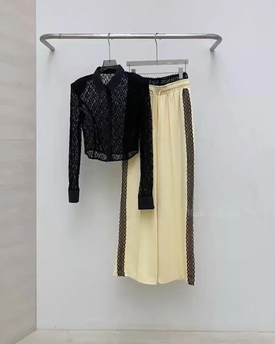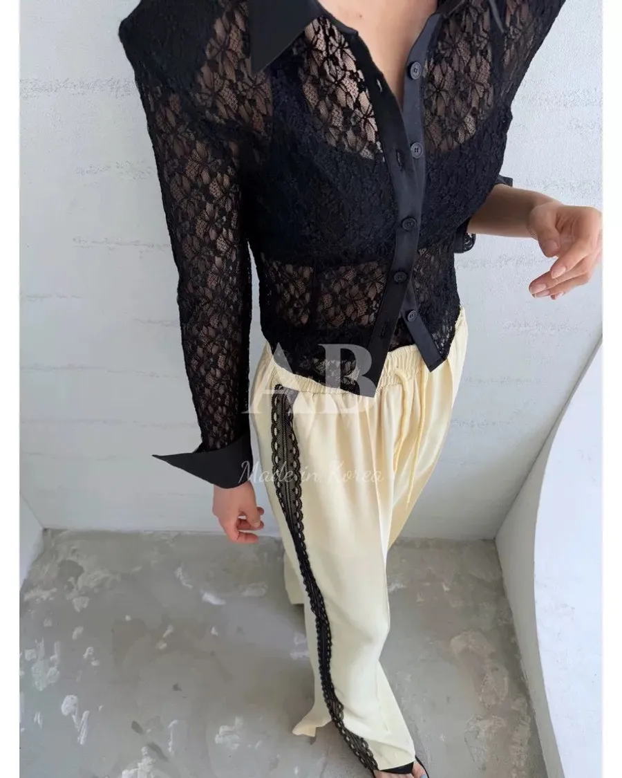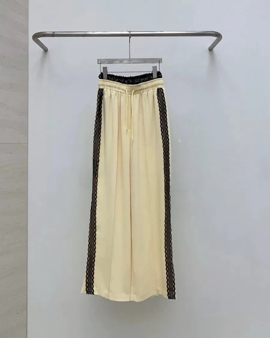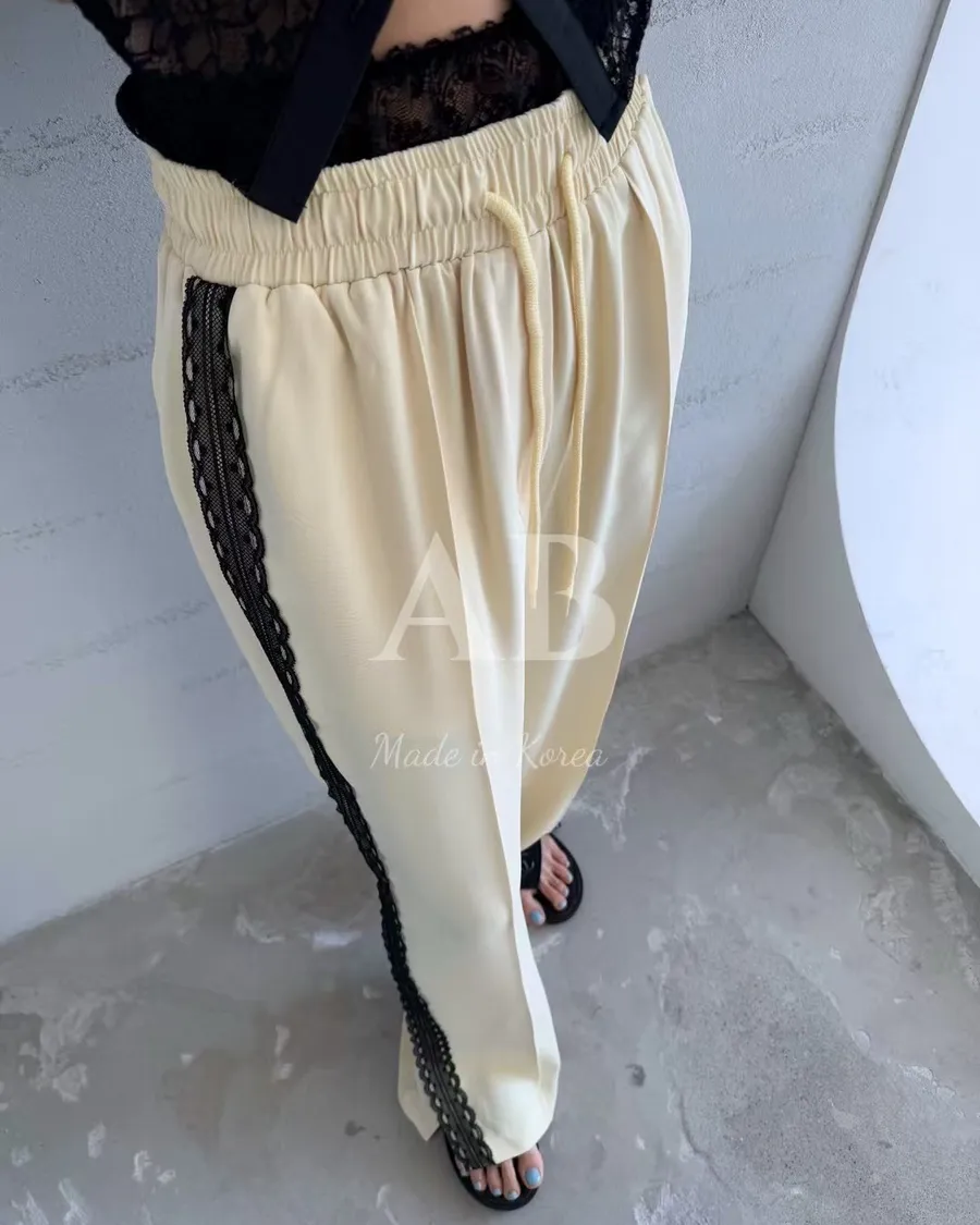 新款AB家蕾絲接拼寬鬆休閒闊腿褲