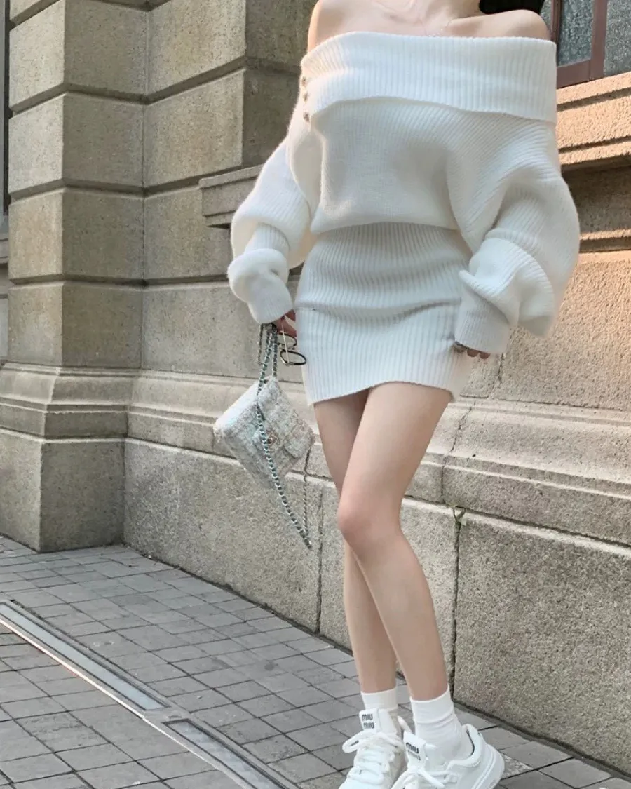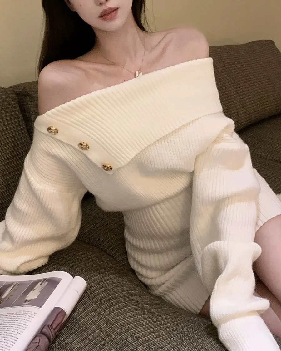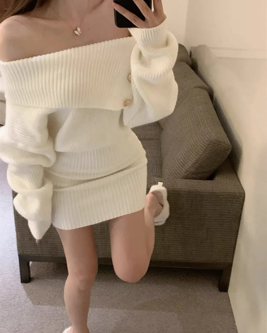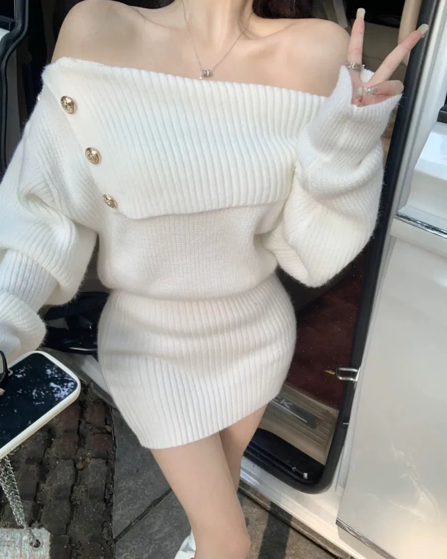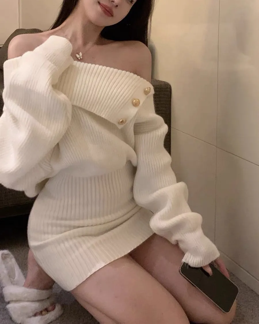 針織斜肩翻領修身包臀洋裝