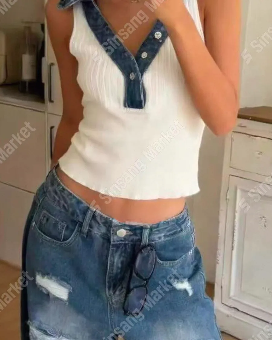 削肩拼接牛仔坑條背心