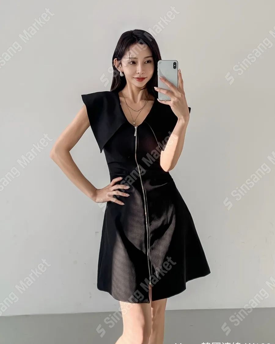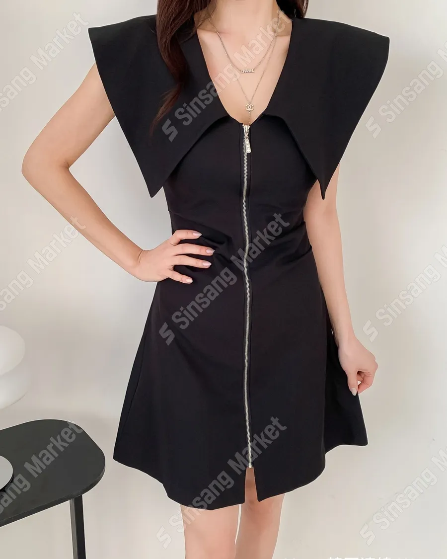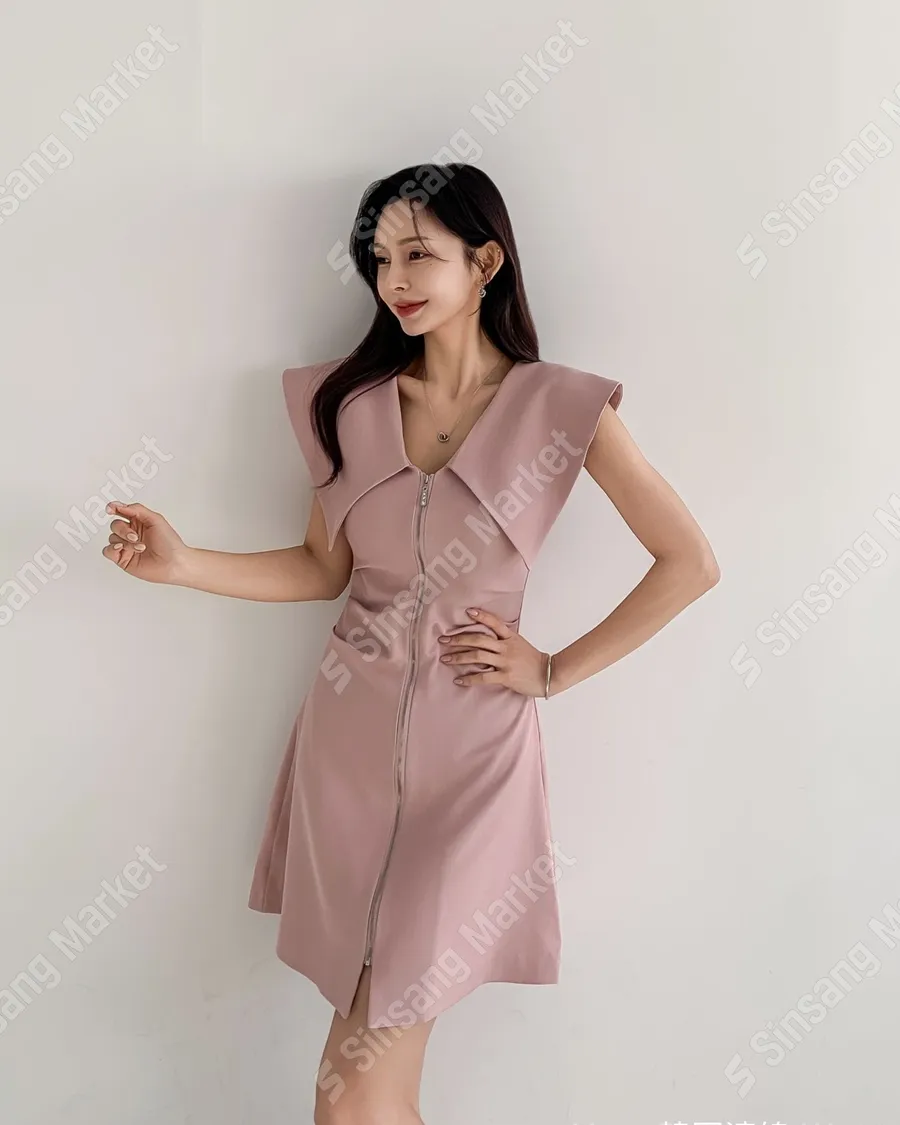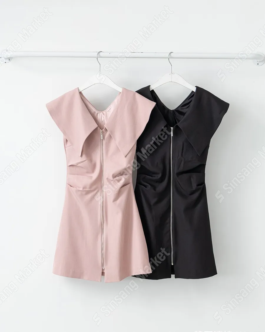 甜美收腰翻領拉鍊洋裝