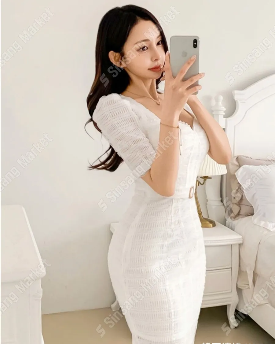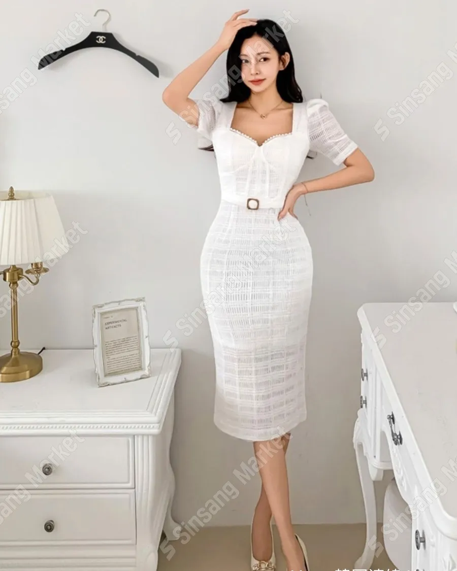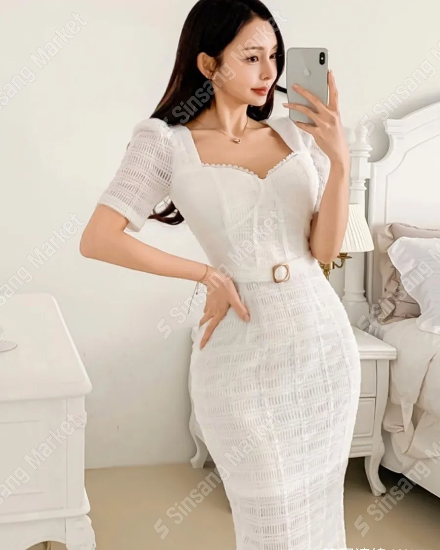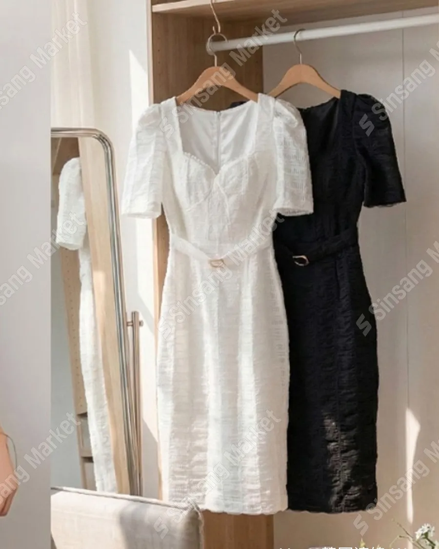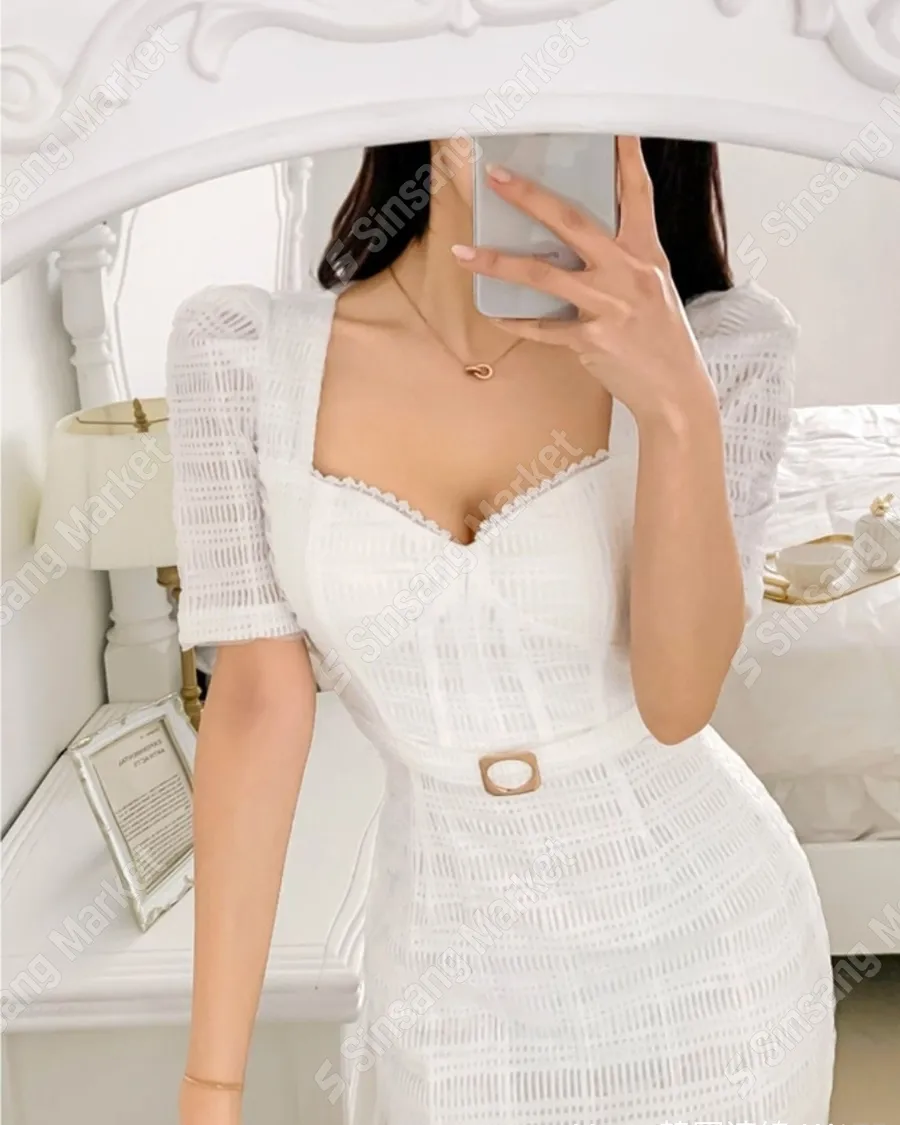 氣質泡泡袖桃心領塔扣洋裝