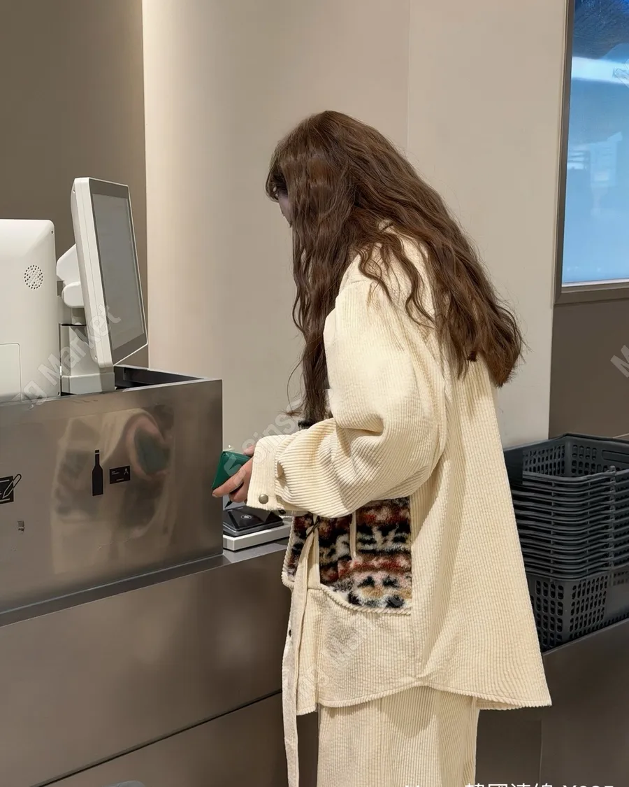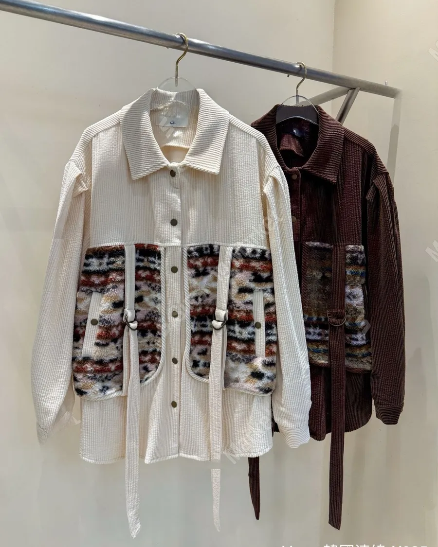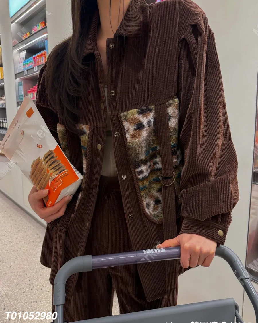 冬季翻領暗扣拼接燈芯絨寬鬆上衣套裝