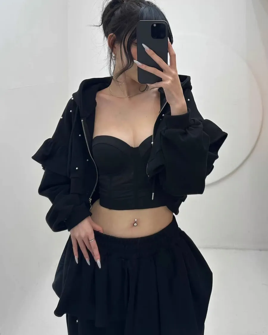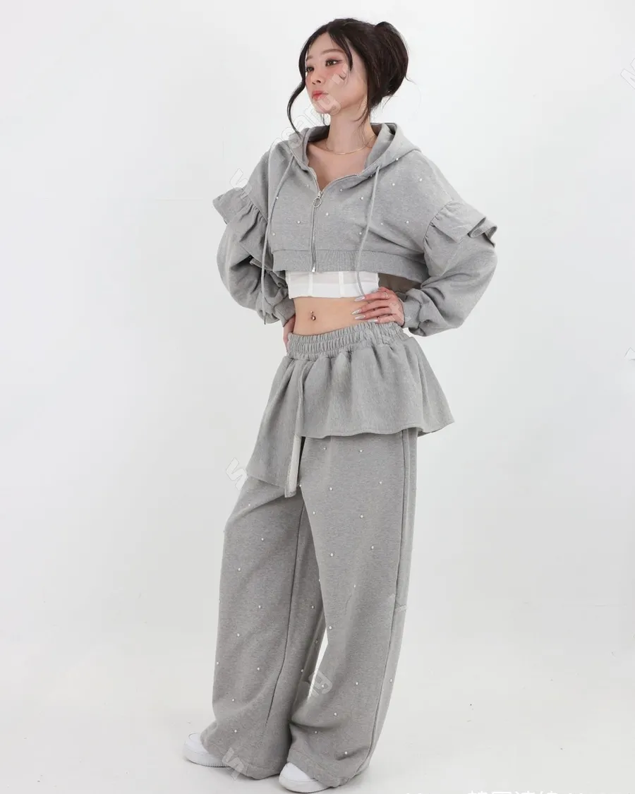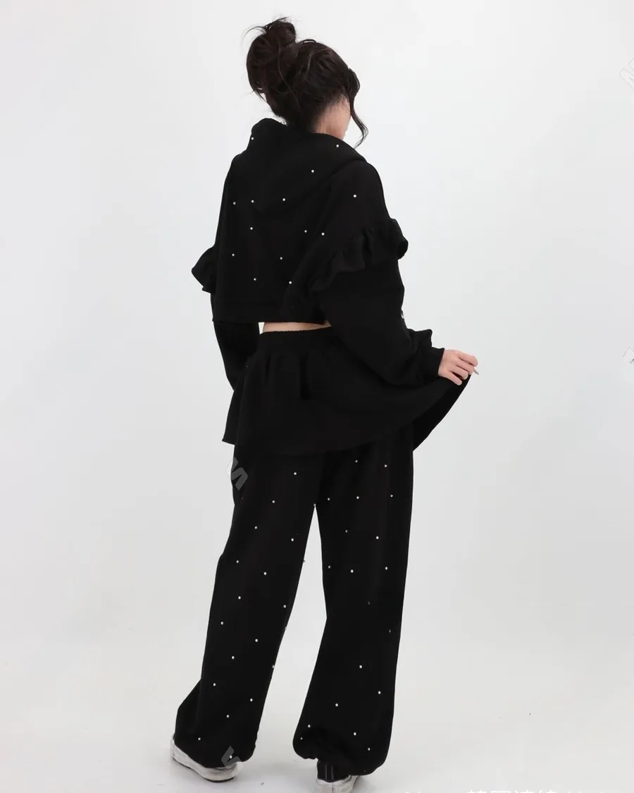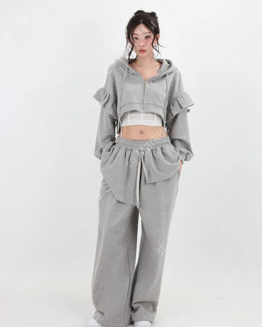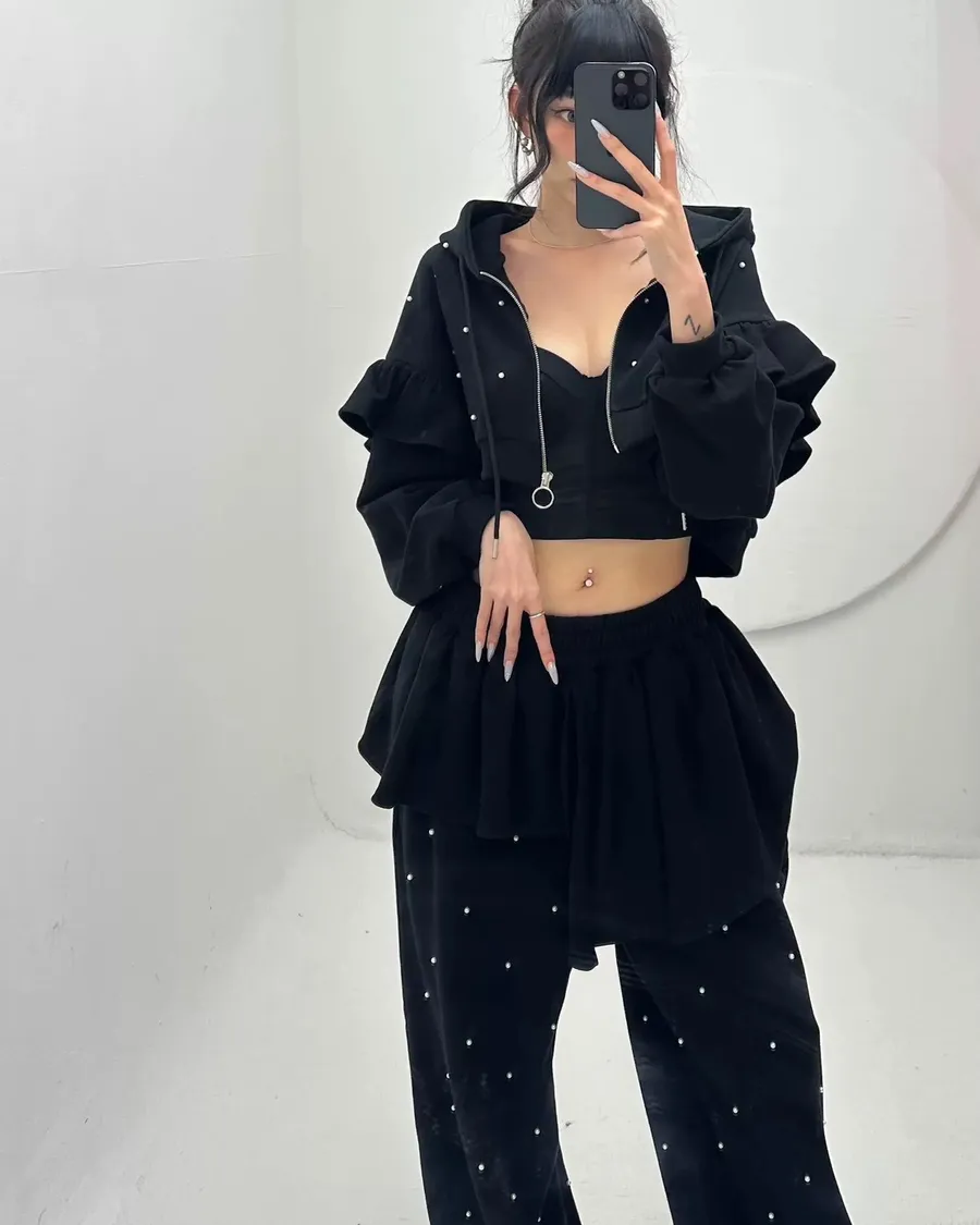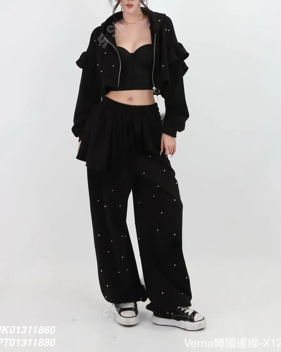 韓國少女時髦釘珠拼接荷葉邊三件套