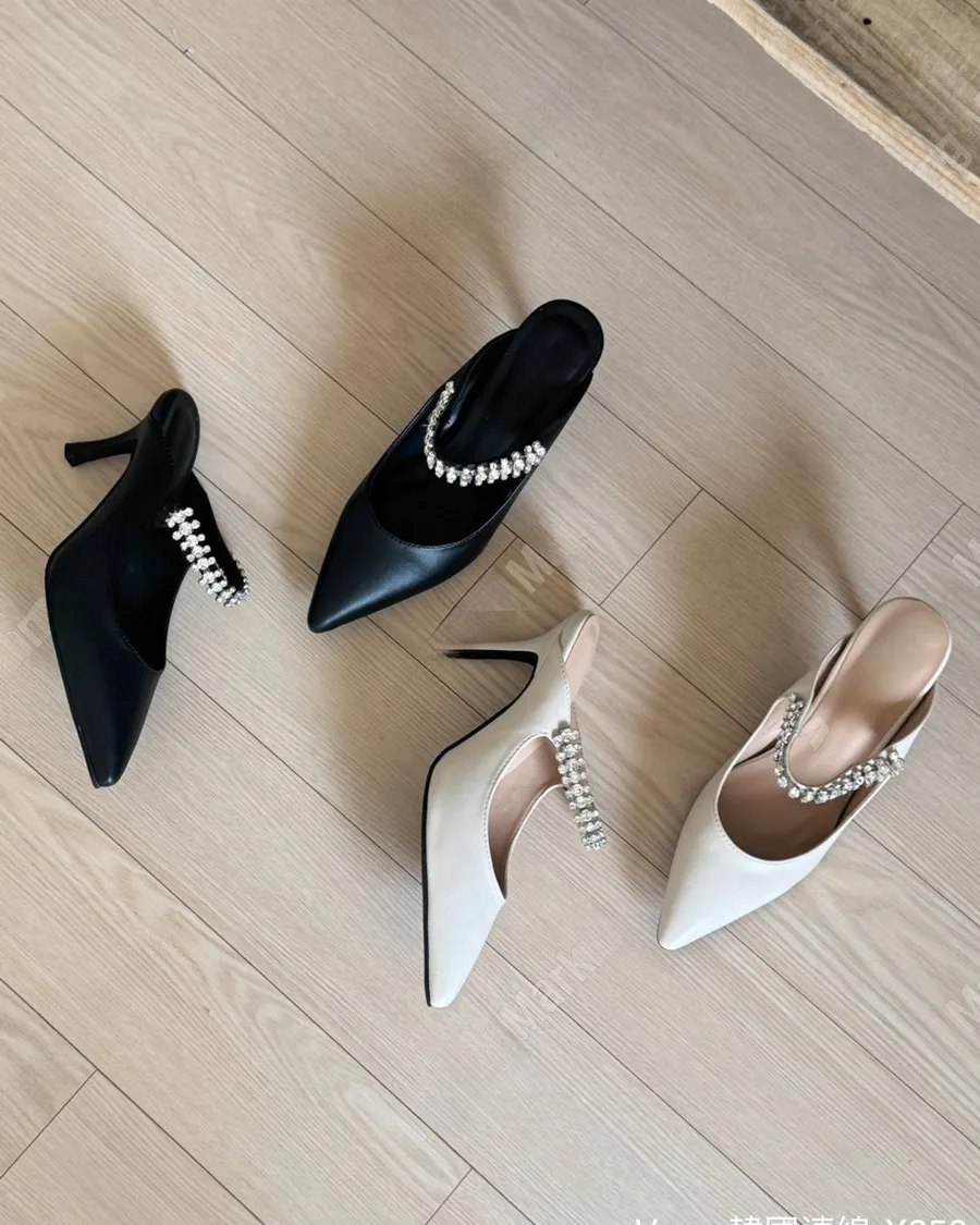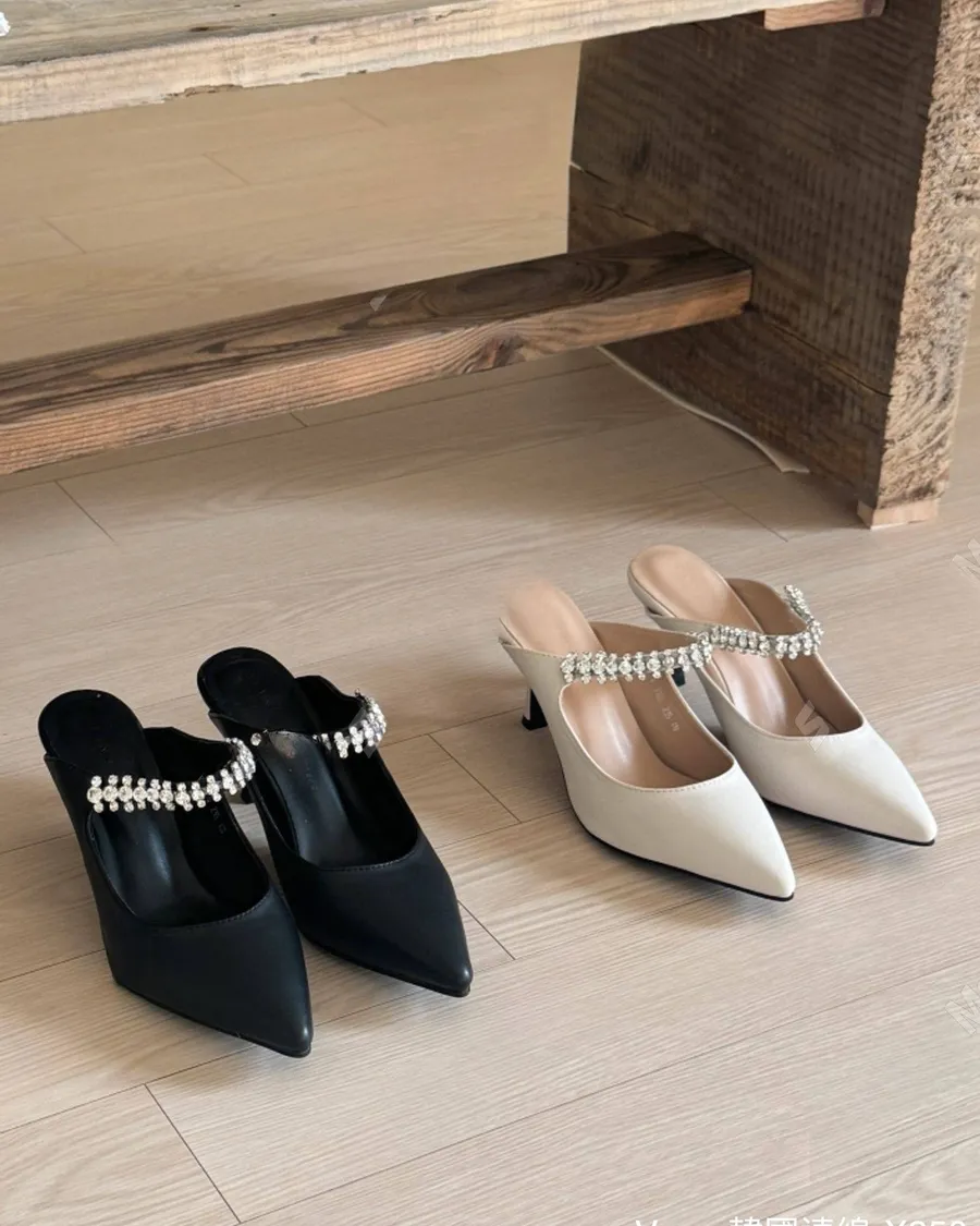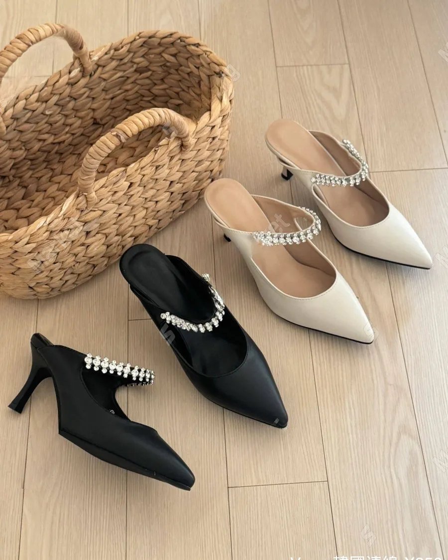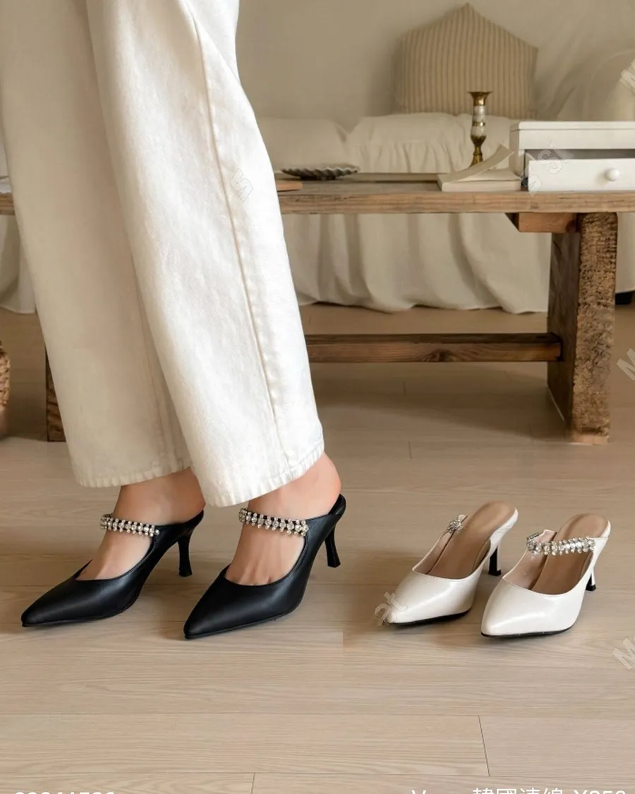 水鑽漆皮尖頭一字帶細跟鞋