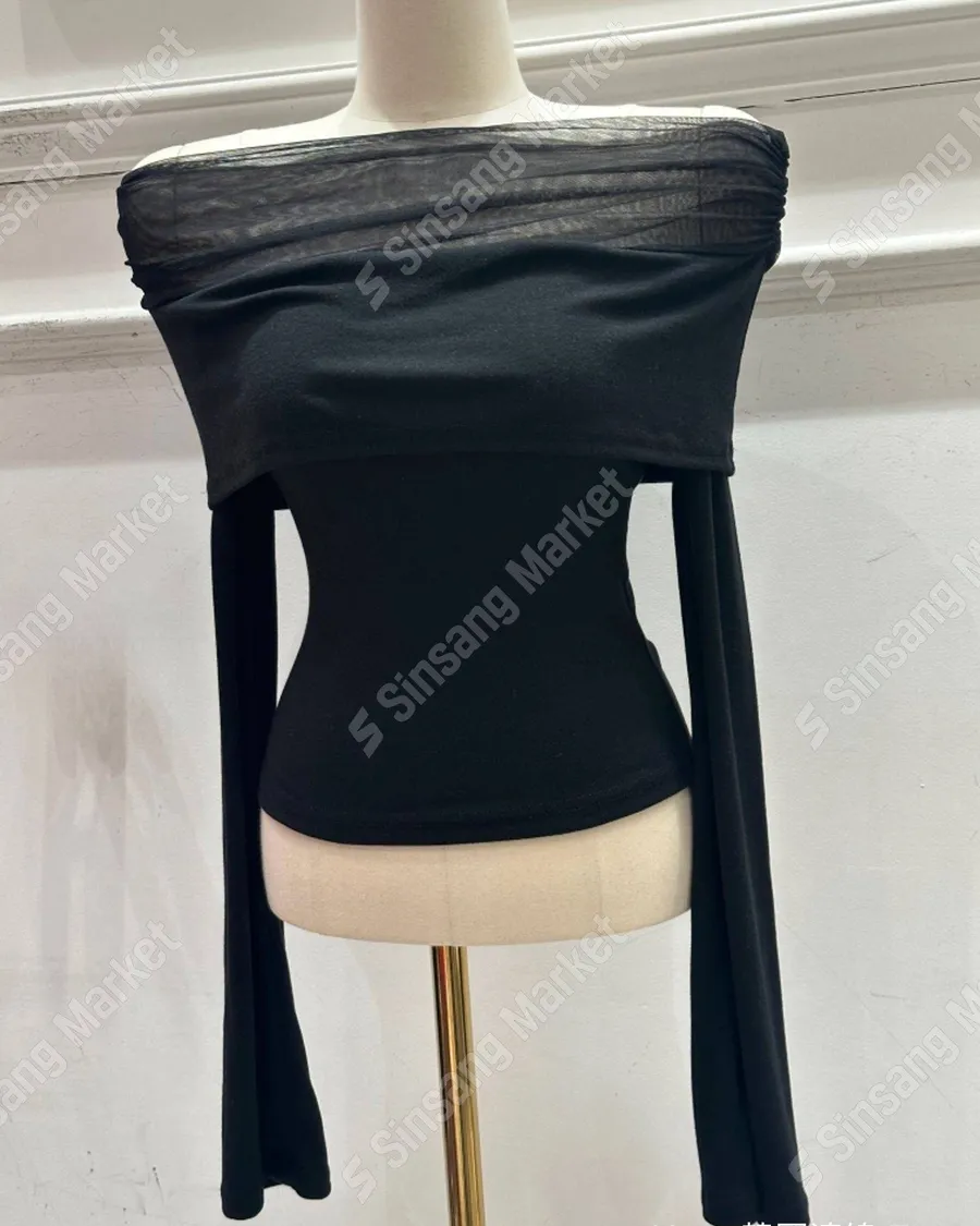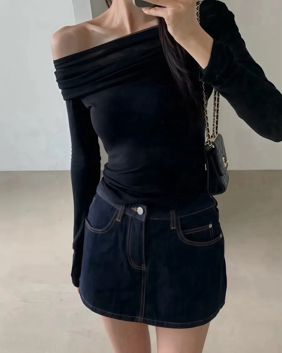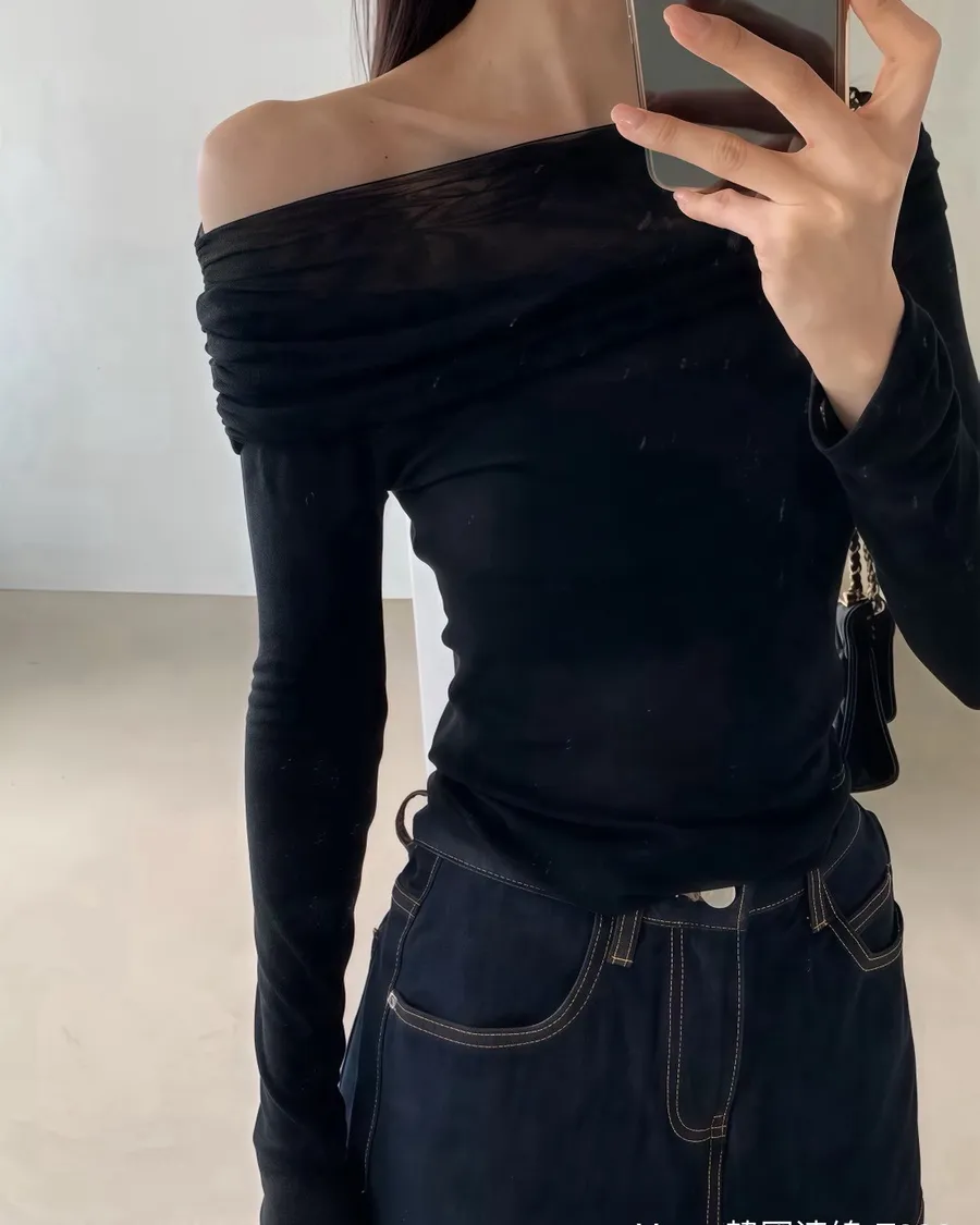 法式網紗一字領顯瘦長袖上衣