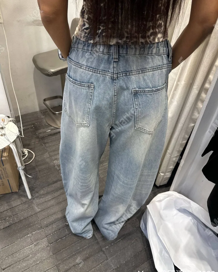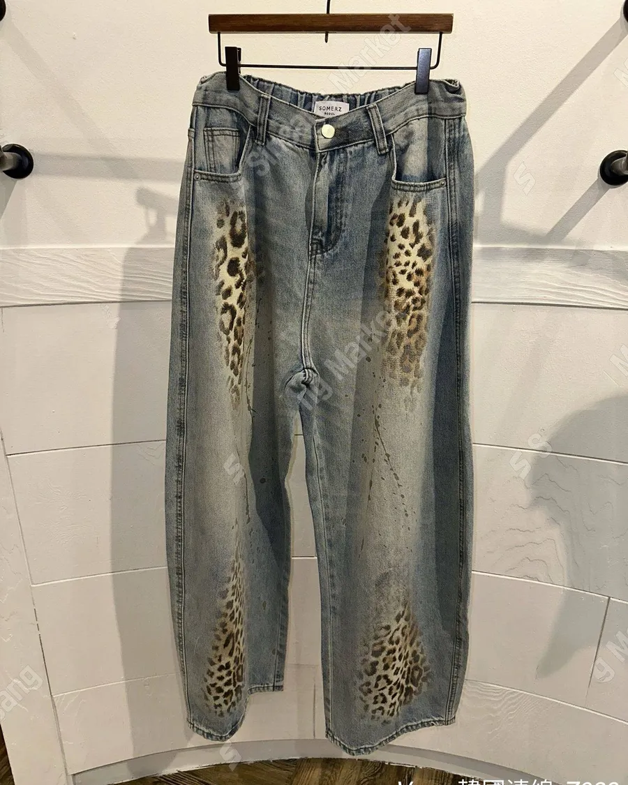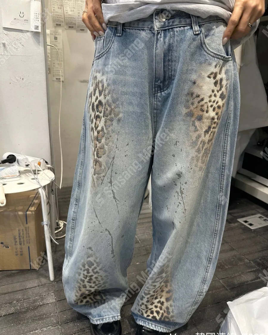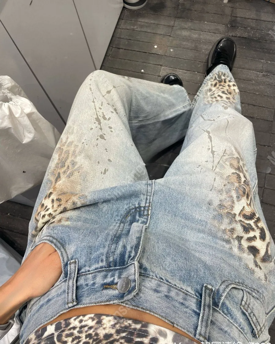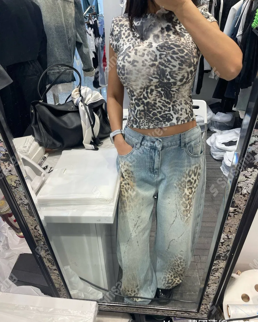 新款個性磨白豹紋闊腿牛仔褲