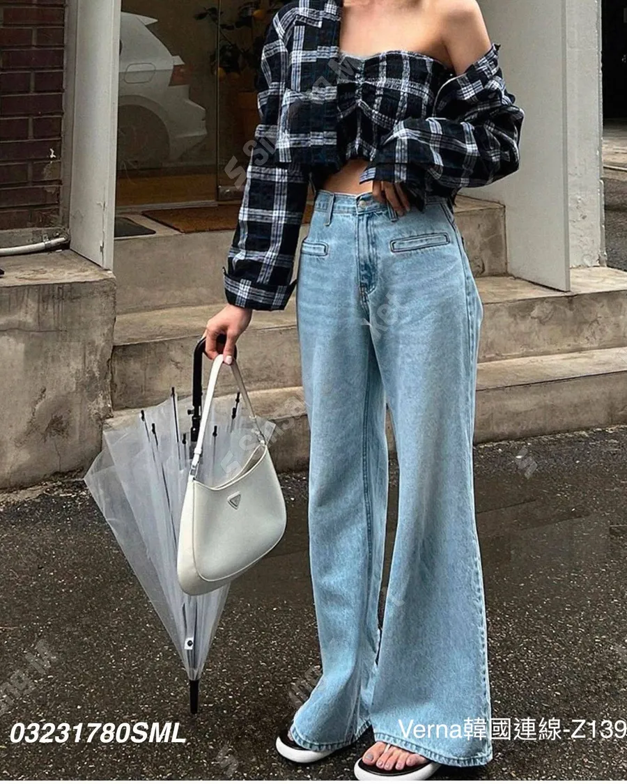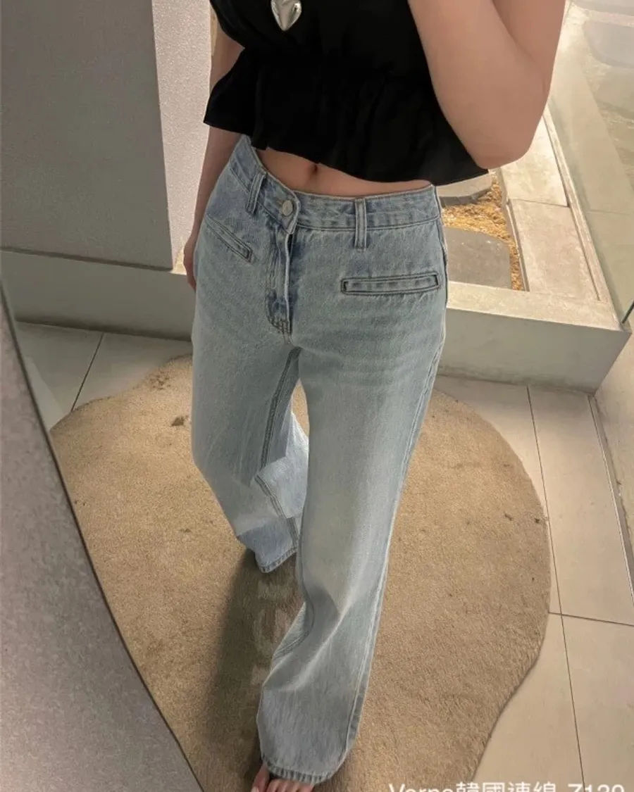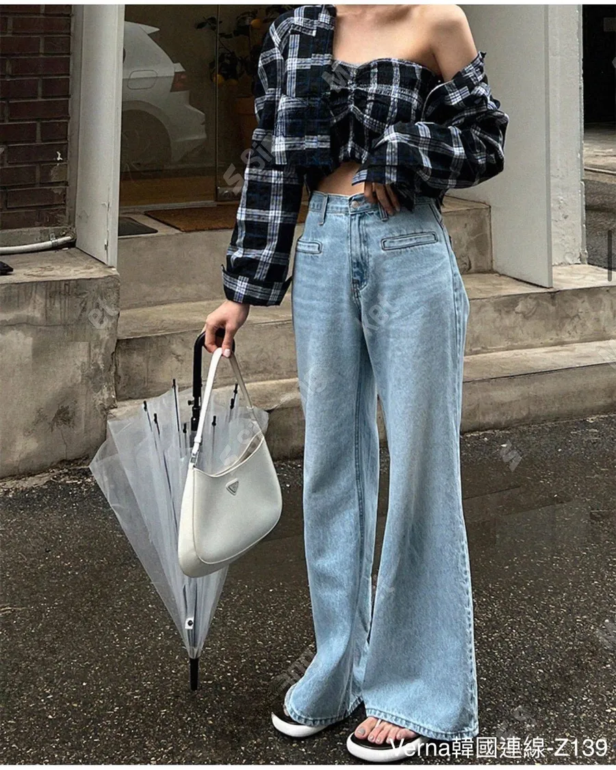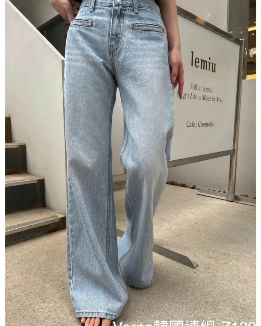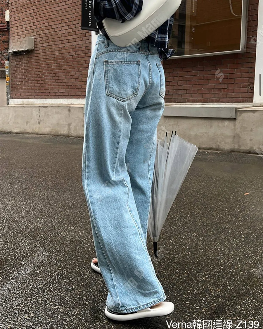 高腰顯瘦明線接拼直筒牛仔褲