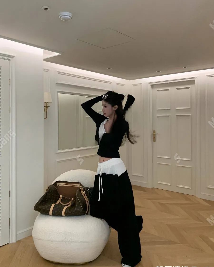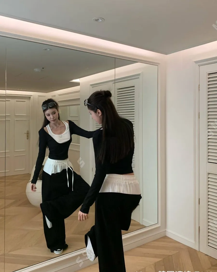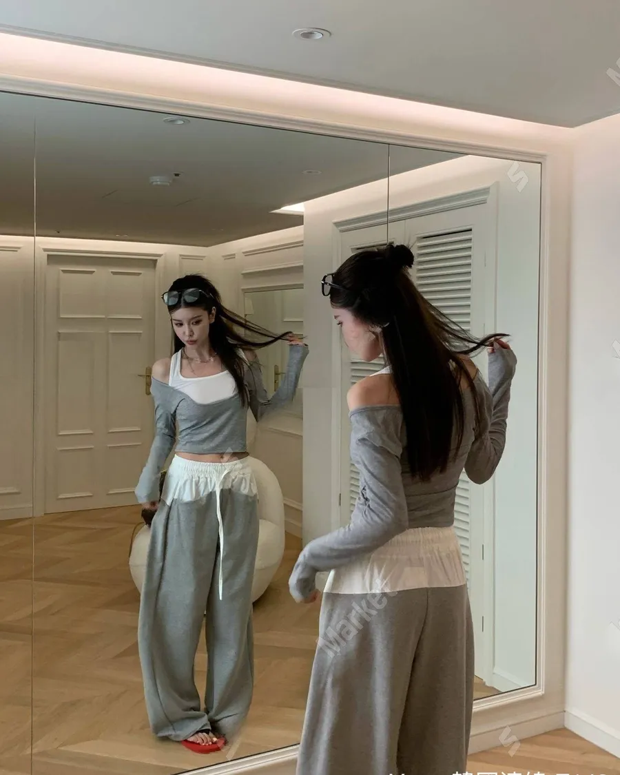韓系設計款接拼假兩件休閒套裝