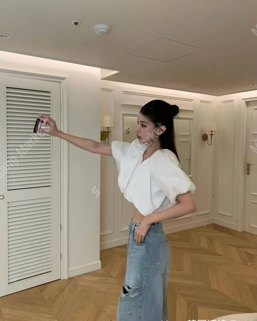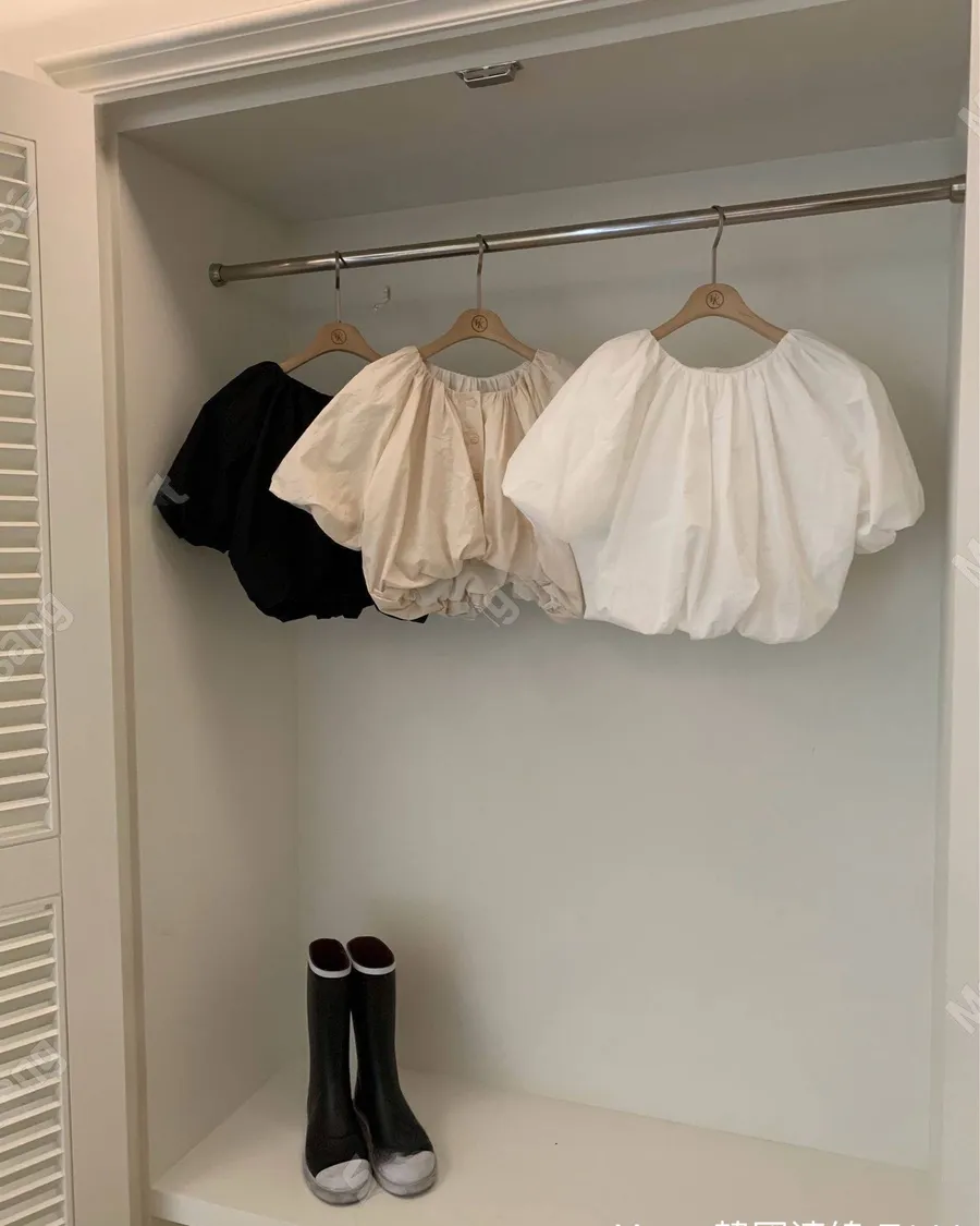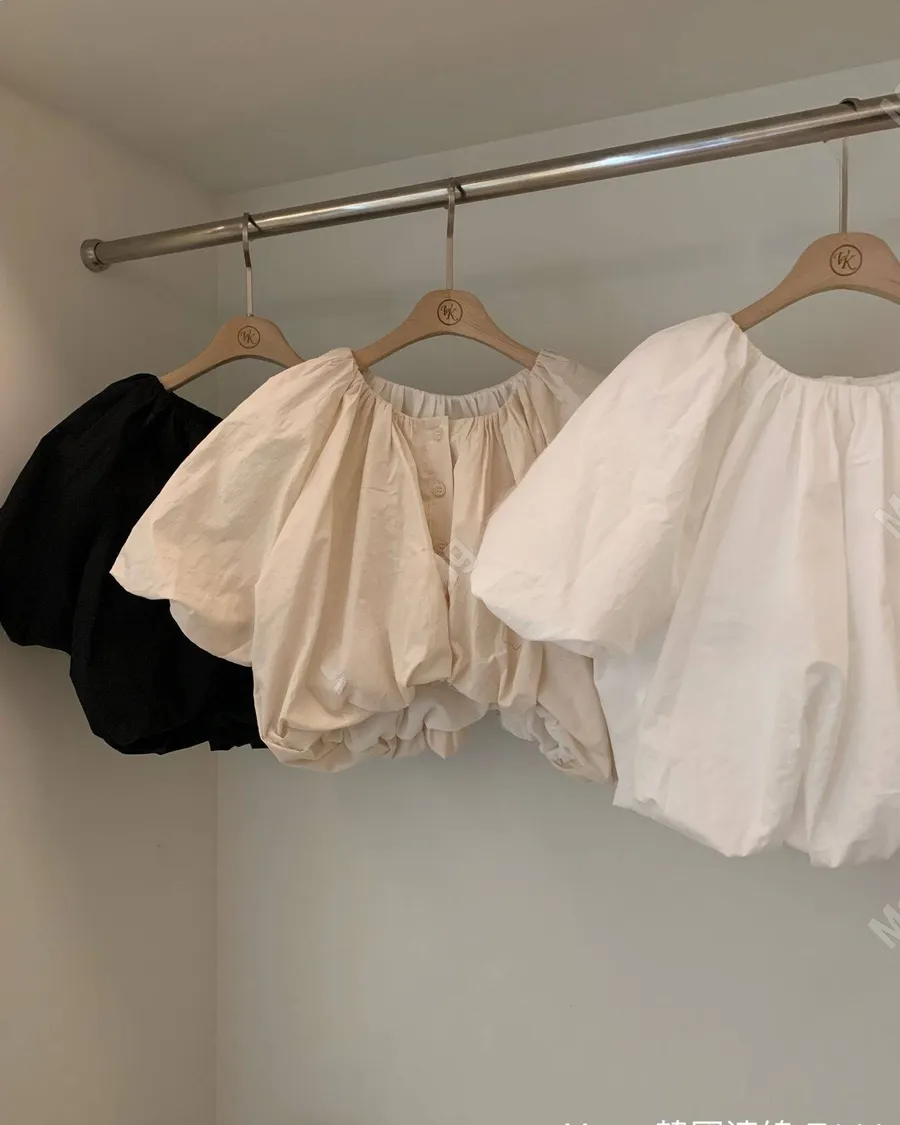 百搭純色短款泡泡袖短袖襯衫